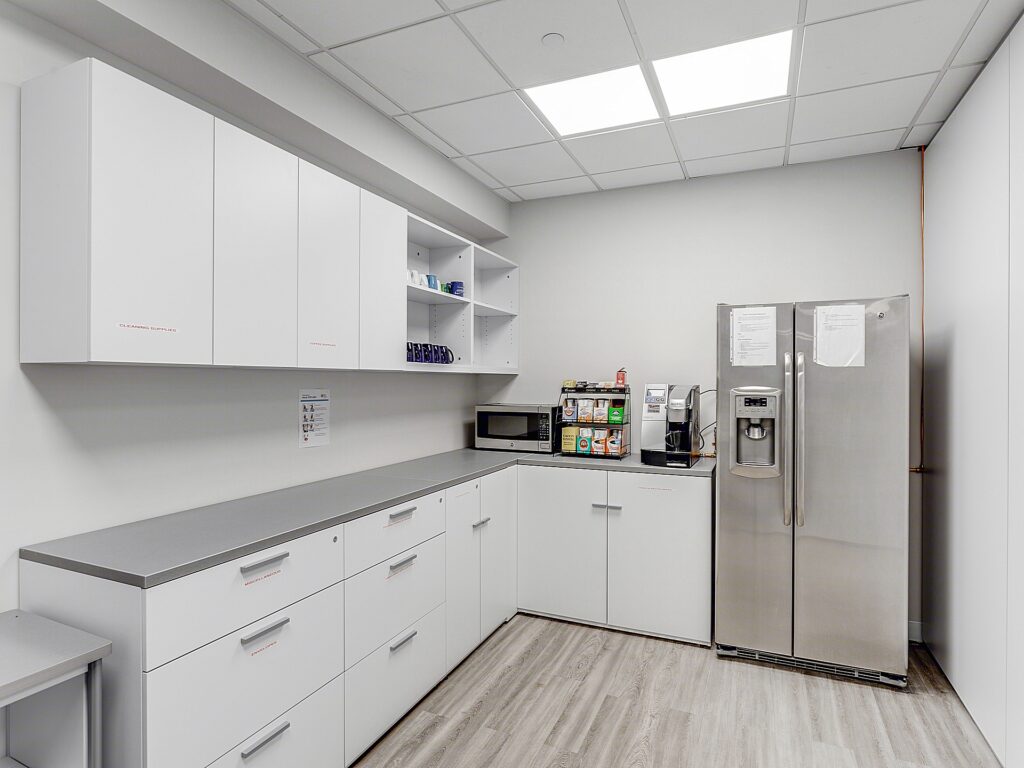A kitchen is tucked just off the main circulation path, providing a dedicated area for staff use that does not interfere with primary work zones. Supporting utility areas, including storage and copy space, are strategically placed to maintain efficiency while keeping the layout uncluttered.
