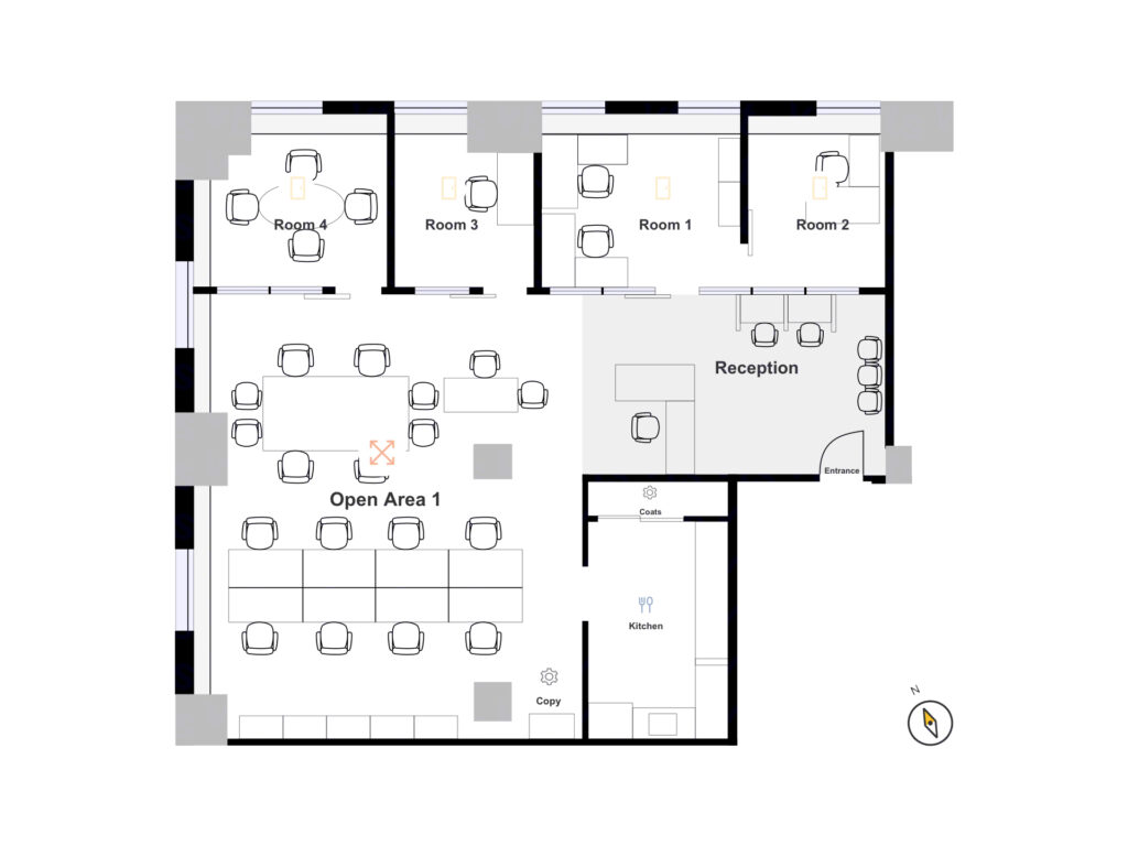Beyond reception, the layout transitions into an open work area that accommodates 8 workstation seats arranged in a clean, linear configuration. Desks are positioned to maximize efficiency while maintaining comfortable spacing, and the presence of structural columns is integrated into the layout without interrupting workflow. This central zone serves as the operational core of the office, allowing team members to collaborate while remaining visually connected.