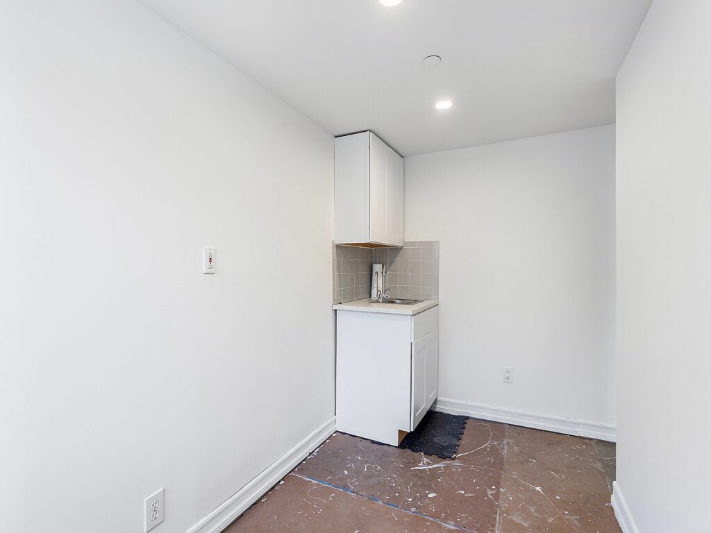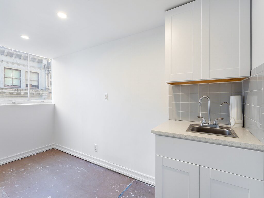 A full wet pantry with upper and lower cabinetry is tucked into the southern corner, providing a natural break area without disrupting the flow of the workspace. Stone countertops, stainless fixtures, and built-in shelving give it both style and storage, supporting day-to-day convenience. Across from the pantry is a private, in-suite restroom, a coveted amenity in boutique-sized office spaces.