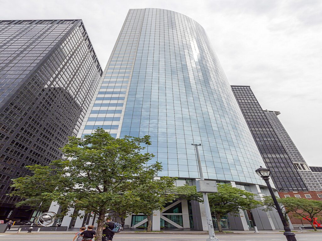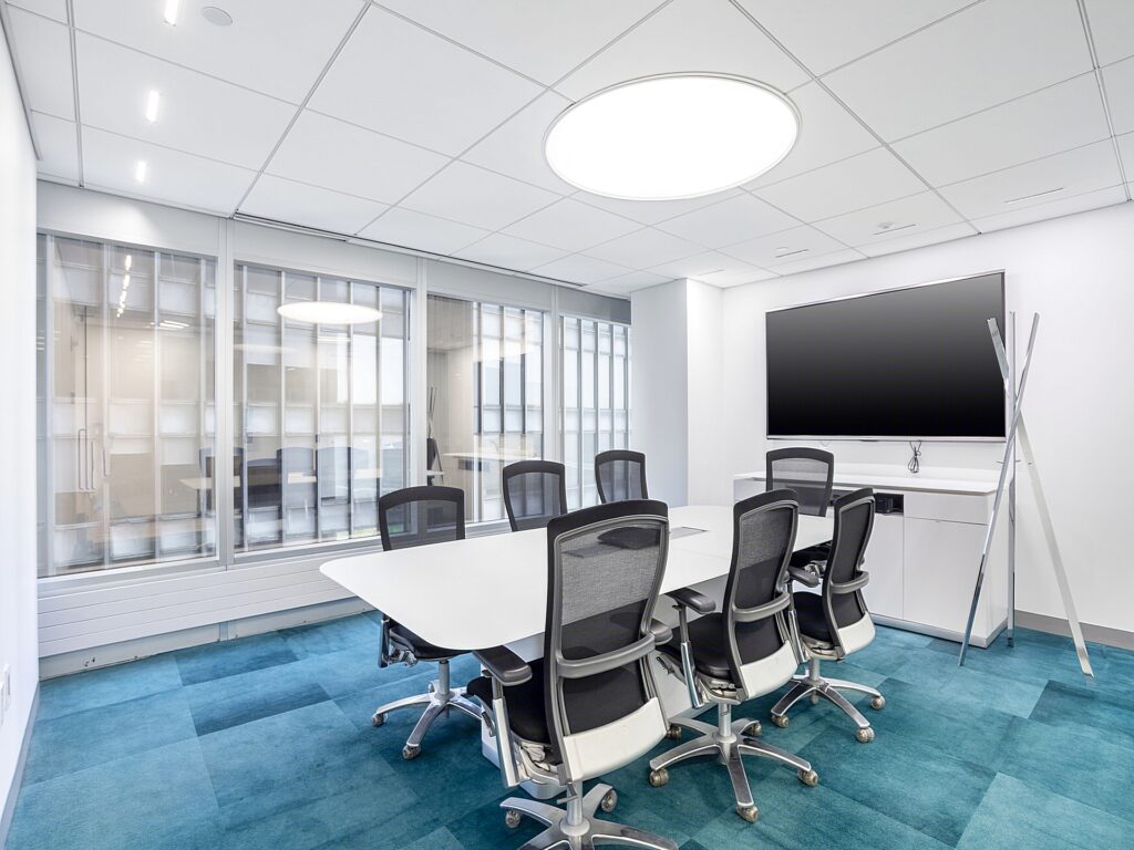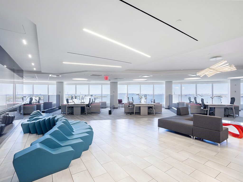 Flanking the open space are glass-front perimeter rooms that can serve as private offices, small meeting rooms, or executive suites, each outfitted with modern furnishings and benefiting from expansive sightlines across the harbor. Two enclosed conference rooms sit adjacent to the core and offer flexible meeting capacity, while a third larger room features wall-mounted AV equipment, executive seating, and acoustic separation from the surrounding space. A dedicated IT room, multiple storage closets, and elevator core with integrated security systems support operational efficiency.