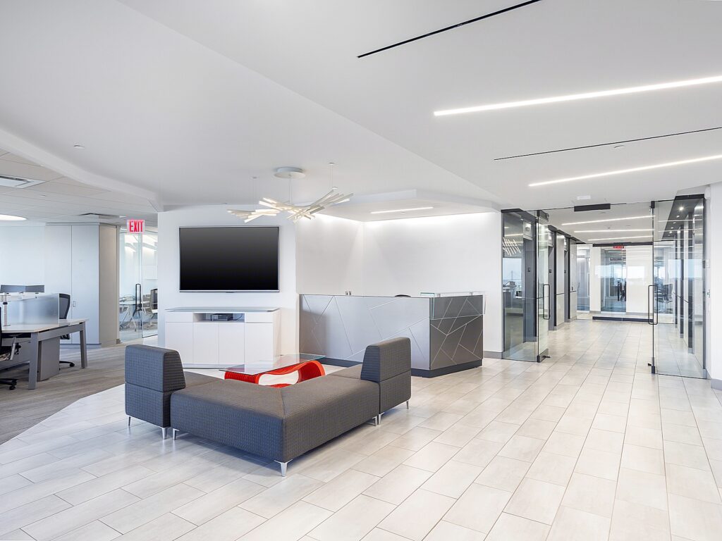 State Street Office for Lease as the 11th floor of this distinctive downtown tower presents a fully built full-floor suite designed for functionality and visual impact. As you enter, the reception area is sleekly finished and set against a bright modern lobby that immediately introduces the premium character of the space. A comfortable seating area to the side creates a welcoming environment for guests and clients. From this entry point, two sets of glass doors open into the main workspace, which is bathed in natural light from full-height windows that curve along the perimeter, offering iconic unobstructed views of the New York Harbor, Statue of Liberty, and Ellis Island.