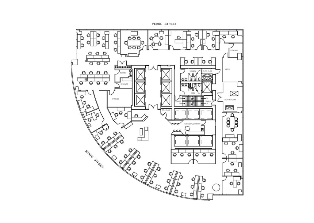 The layout blends a high-density open plan with a collection of private offices and conference rooms, efficiently organized to support teams of all sizes. Along the building’s signature curved glass wall, the open work areas are arranged in multiple clusters of workstations, many of which are positioned along the windowline to maximize natural light and panoramic water views. These areas are interspersed with casual meeting spaces and seating areas ideal for breakout sessions, team collaboration, or client huddles. Toward the western curve of the floor, additional desking configurations line State Street with spectacular sunset exposure, creating one of the most striking working environments in the downtown market.