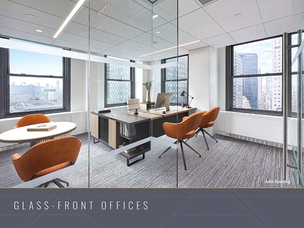 Ceiling heights are consistent with a modern Midtown installation, and the clean white box delivery allows for exposed ceiling or finished drop ceiling design depending on tenant preference. The perimeter window line offers a consistent rhythm of light and views, enhancing both private and open work environments once built out. The overall layout lends itself to efficient circulation, departmental zoning, and a clear separation between client-facing and internal work areas.