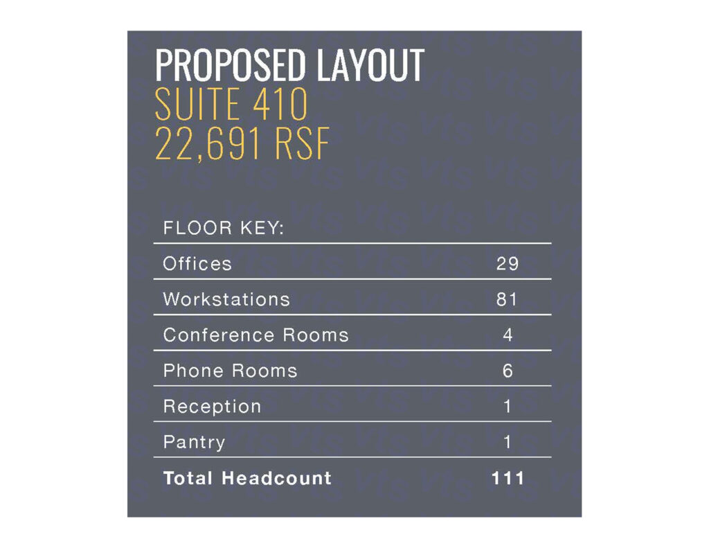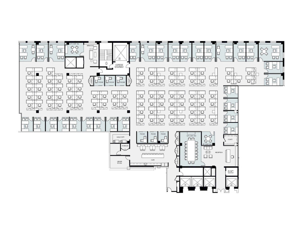 A highly efficient test fit for the approximately 22,691 rentable square foot partial fourth floor at 220 East 42nd Street supports a full-scale office installation designed for roughly one hundred eleven employees, incorporating twenty-nine perimeter private offices aligned along the window line to maximize light exposure and executive presence, complemented by eighty-one open workstations organized in a dense but highly navigable central benching configuration. Circulation flows from a defined reception area near the core into a series of interconnected open work zones, with four conference rooms of varying scale strategically distributed to support both formal boardroom functions and mid-sized team collaboration, while six dedicated phone rooms are positioned off the main corridors to provide acoustic privacy without interrupting workflow. A centrally located pantry and café hub anchors the layout, creating a natural gathering point that connects both wings of the floorplate and reinforces internal movement between departments. Support spaces including storage, copy areas, and IT infrastructure are integrated efficiently along the interior core, preserving the perimeter for revenue-generating or leadership-facing rooms. The configuration balances a strong ratio of private offices with a substantial open seating plan, making it well suited for professional services, legal, financial, or hybrid users requiring both confidentiality and team-based interaction, all while maintaining clean sightlines, logical departmental zoning, and an overall layout that can be executed as a polished, Class A prebuilt environment within the existing white box framework.